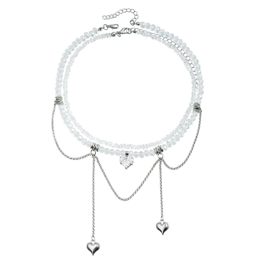 Heart-shaped Zircon Double Chain Tassel Design Collarbone Chain Crystal Necklace