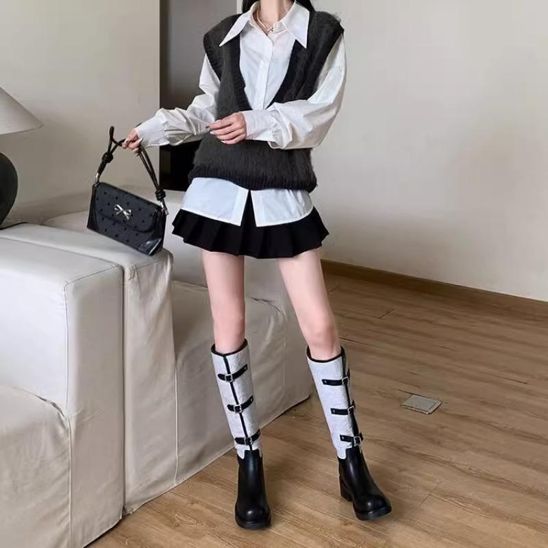 Meng Ziyi black and gray splicing knight boots women's autumn and winter new belt buckle high boots long boots fashion boots