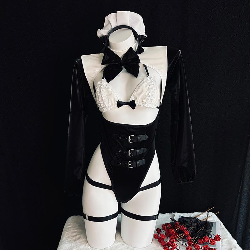 Sexy Open Bra Patent Leather Bodysuit Anime Maid Cosplay Costume Women Sexy Backless Maid Uniform Set Halloween Carnival Clothes