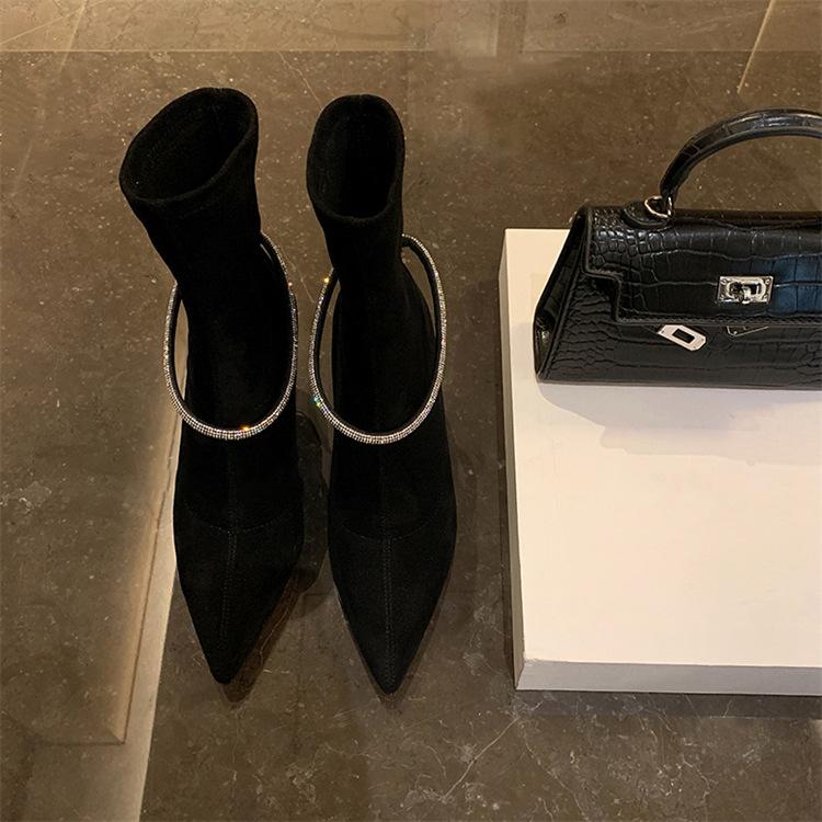 Beautiful CRY~! Huge and thin! Rhinestone buckle pointed thin high heel short boots elastic Martin boots single boots