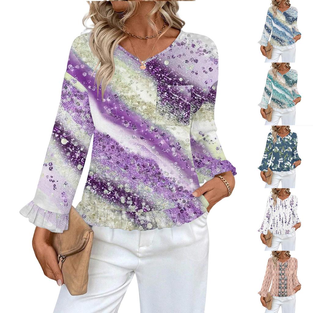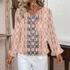 Women's Casual Fashion Ruffle V-Neck Pocket Retro Print Long Sleeve Top