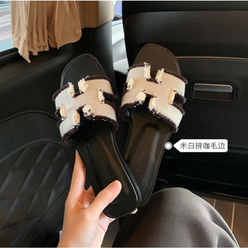 ~ Heavy industry imported leather classic round head rough edge letter flat bottom cool slippers women's summer wear