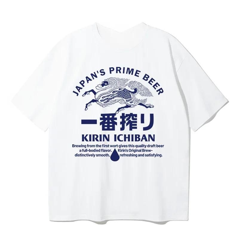 Japonské KIRIN Kirin Pivo Tričko Léto Muži a Ženy Stejný Styl Americký Retro Ins Móda Volné Krátké Y2k Top