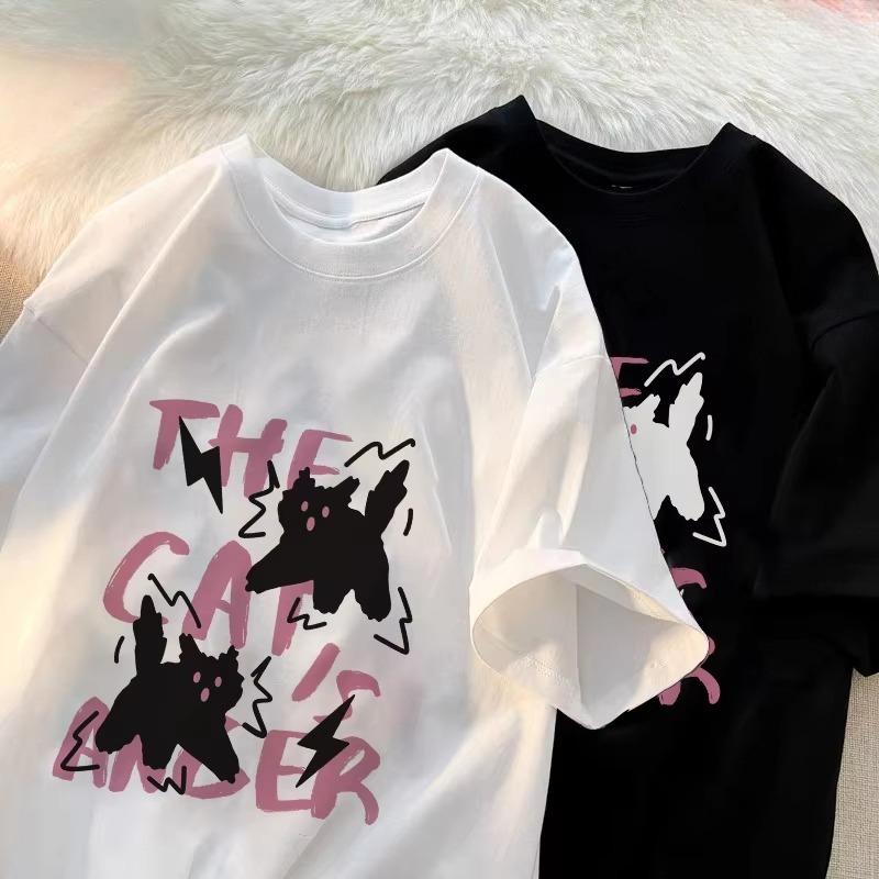 2025 Women's Horror Cat Print T-shirt for Summer Pure Cotton Short Sleeved Casual Y2k Top Suitable for Both Men and Women Tops