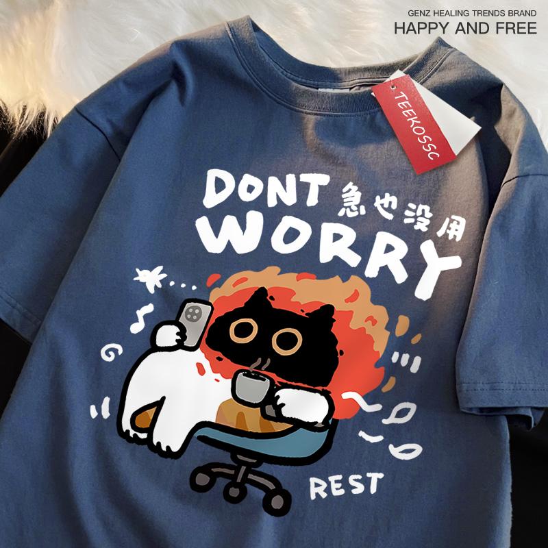 Dont Worry Fun Cat Print Japanese Style Clothing Men Women High Quality T-Shirt Summer Cotton T-Shirts Oversized Loose Tops