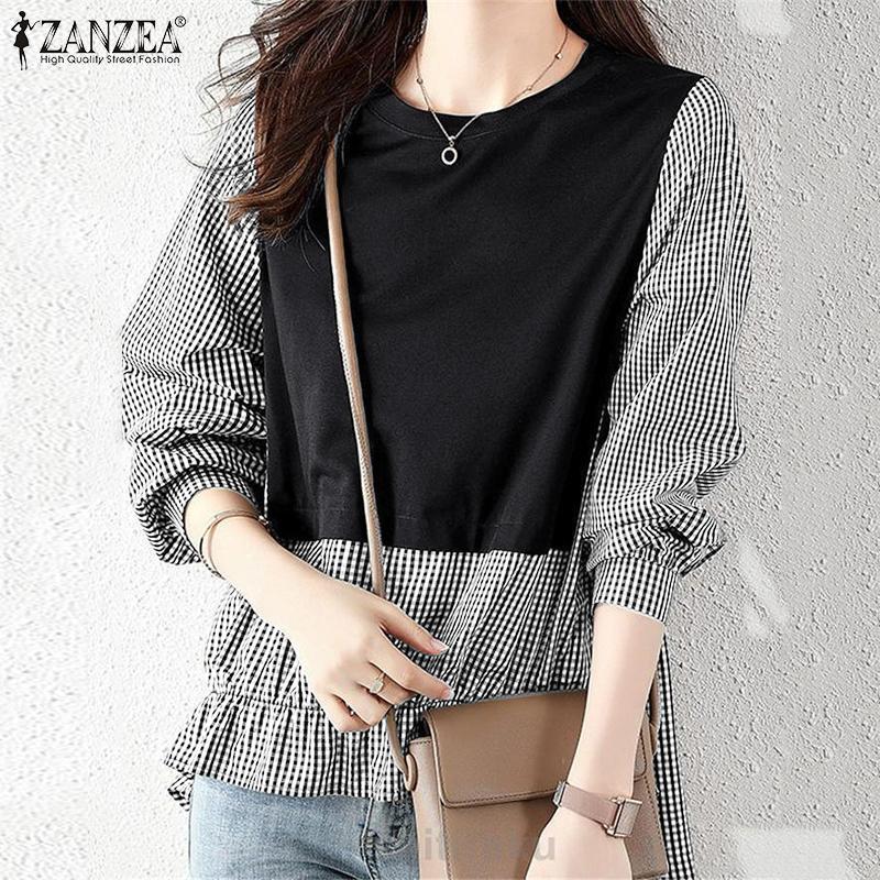 ZANZEA Women Casual Round Neck Plaid Print Long Sleeve Blouse