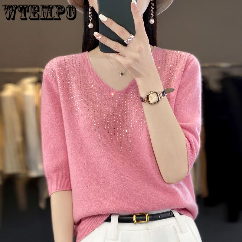 V-neck Knitted Sweater for Women Casual Three-quarter Sleeve Sweater for Women Loose Large-sized Short Top for Spring and Autumn Pullover