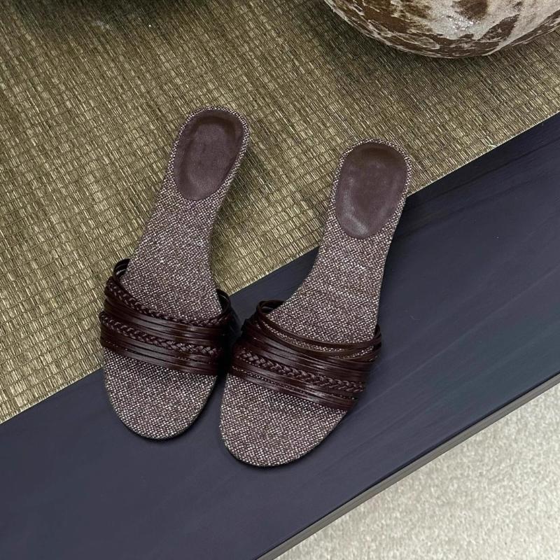 Módní 2025 Nové letní dámské pantofle s kulatou špičkou, popruhy na tenkém a nízkém podpatku, módní párty pantofle