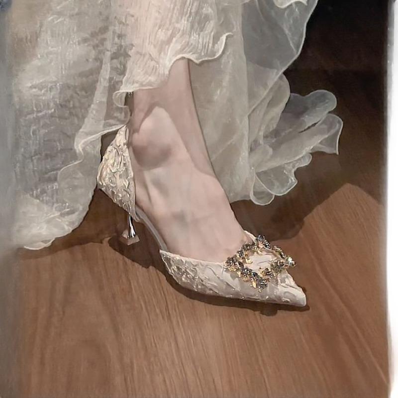 Fashion Fashion Crystal Buckle Med Heel Pumps Women Pointed Toe Thin Heels Party Shoes Woman 2024 Slip-On Rhinestones Sexy Zapato Mujer