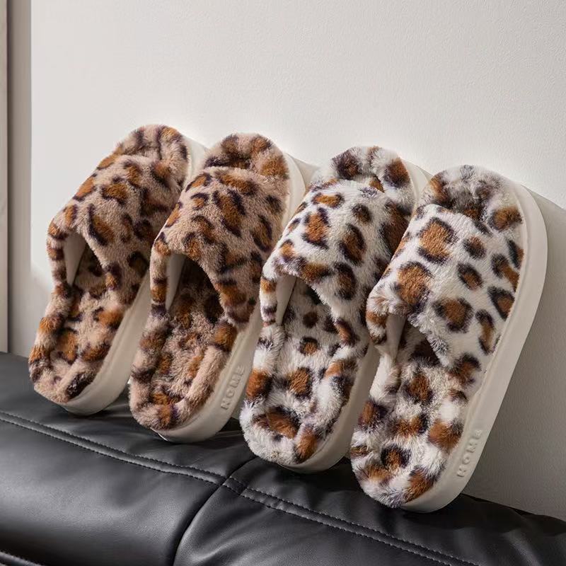 Fashion Couple's One Word Slippers Winter New Fashion Leopard Women Home Shoes Lightweight Comfortable Non Slip Men's Plush Shoes