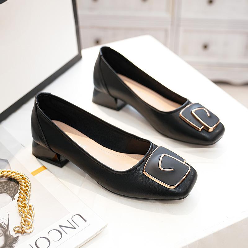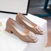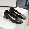 Fashion Elegant Ladies Office Dress Shoes Cow Leather Pumps Woman Medium High Heel Mary Janes Metal Button Loafers Femme Square Toe Shoe