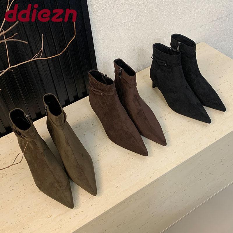 Fashion New Fashion Flock Women Ankle Modern Boots Heels Shoes Pumps Female Pointed Toe Ladies Short Boots With Zippers Shoes