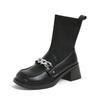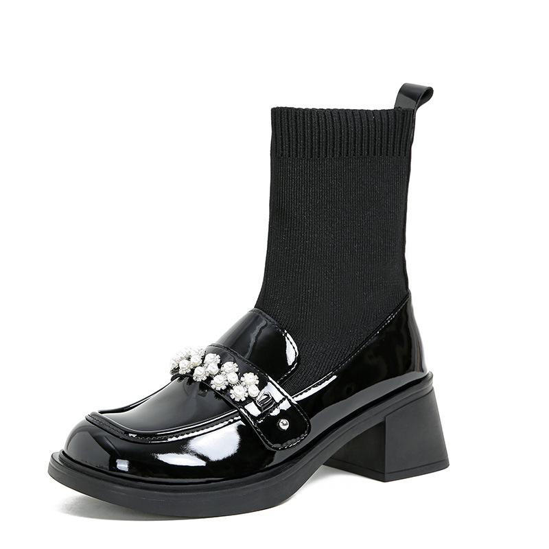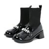 Fashion pearl flower buckle boots women thick high heels winter botas shoes japanned leather & knitting patchwork ankle botines female
