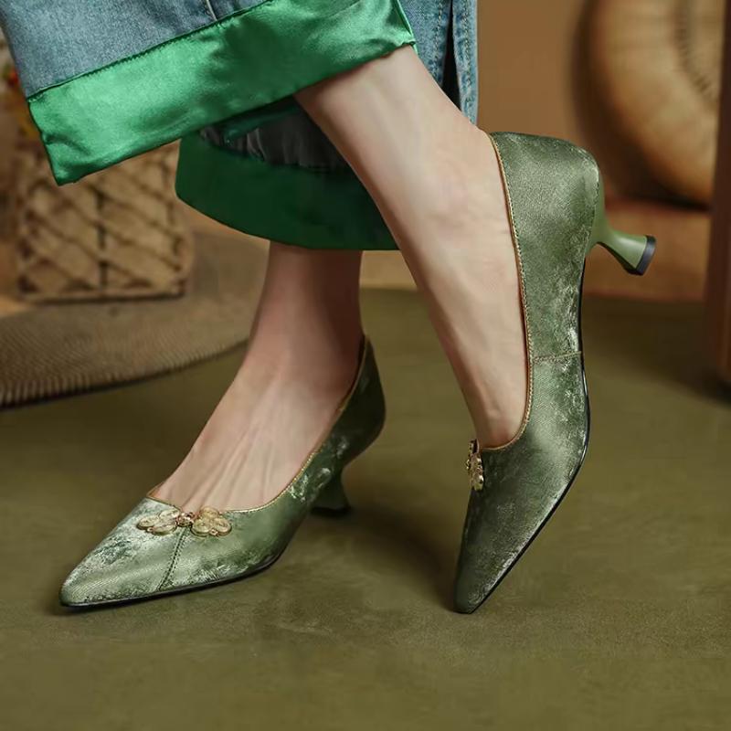 Móda Módní Nový Čínský Styl Mělký Výstřih Pohodlné Zdobené Knoflíky Podpatek ve Tvaru Sklenice na Víno Kryt Špičky Špičatá Špička Střední Podpatek