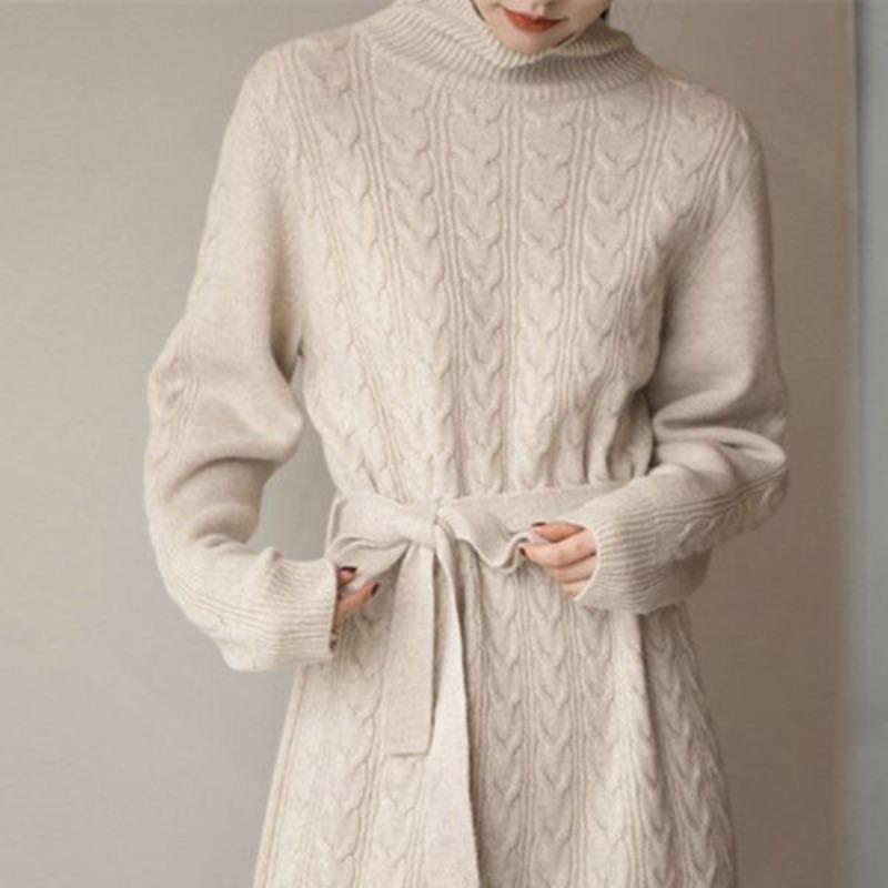 Lace-up waist high-necked knitted dress for women's autumn and winter new loose and thin over-the-knee primer sweater skirt for women