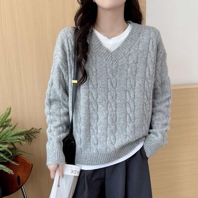 Autumn and winter new retro sweater women's loose and simple wind twist pullover V-neck long-sleeved small bottoming knitted sweater