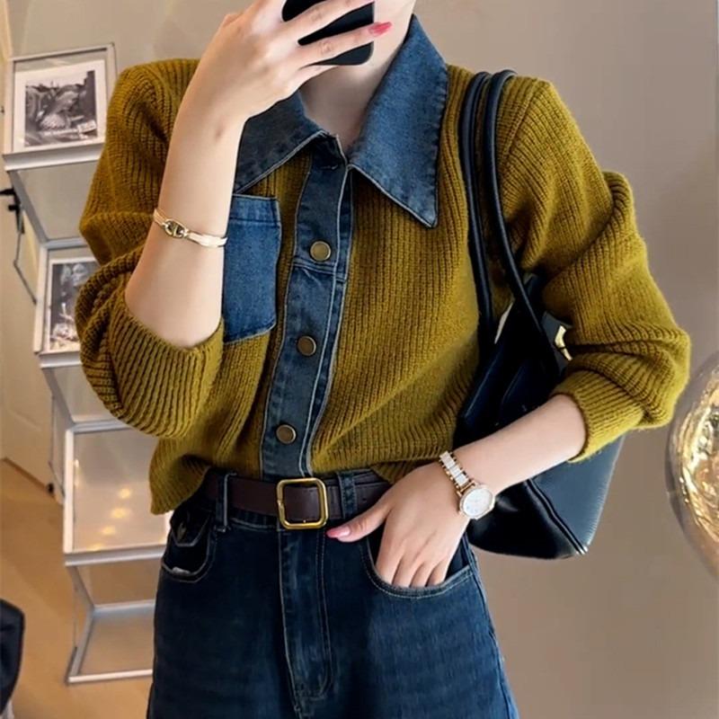 Autumn and winter PO collar short top women's fake two-piece denim collar splicing jacket knitted cardigan