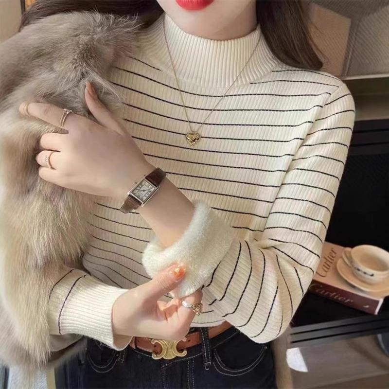 Semi-turtleneck striped color matching integrated fleece plush thick sweater for women's autumn and winter new bottoming knitted sweater for women