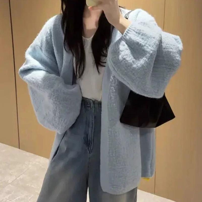 Bark pattern bubble sleeve knitted cardigan for women's autumn and winter new lazy meat-covering and thin sweater versatile jacket for women