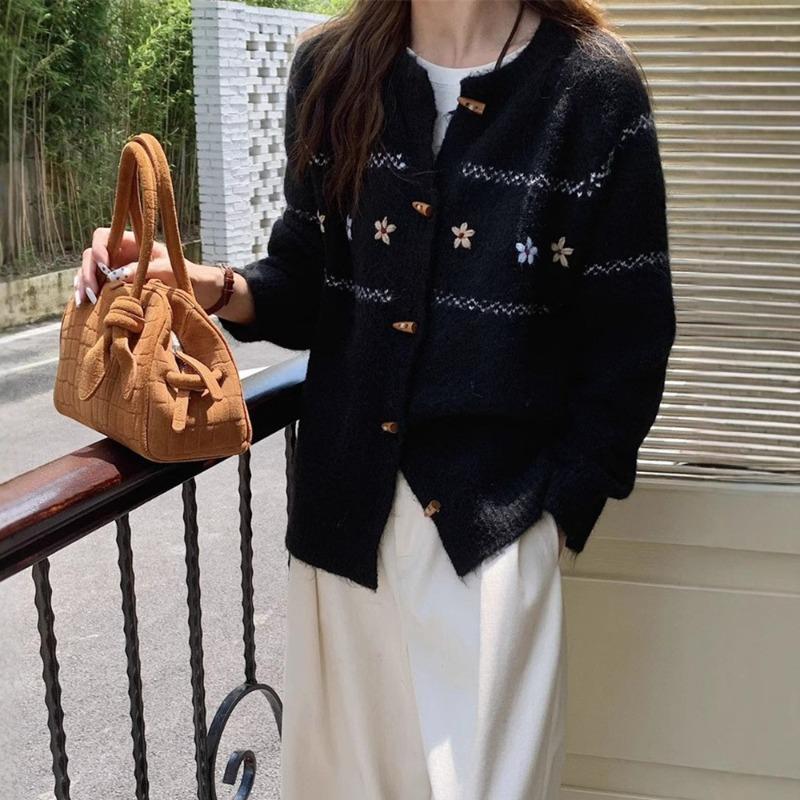 Vintage embroidered flower knitted cardigan women's autumn and winter new lazy wind loose soft waxy jacquard sweater jacket