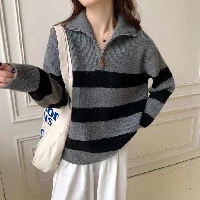 Pullover sweater women's autumn and winter zipper semi-open neck contrasting striped knitted sweater top