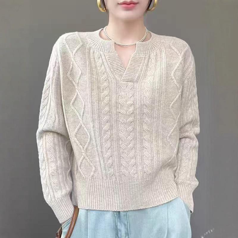 Retro casual pullover sweater women's autumn and winter new lazy loose and thin v-neck solid color knitted sweater top