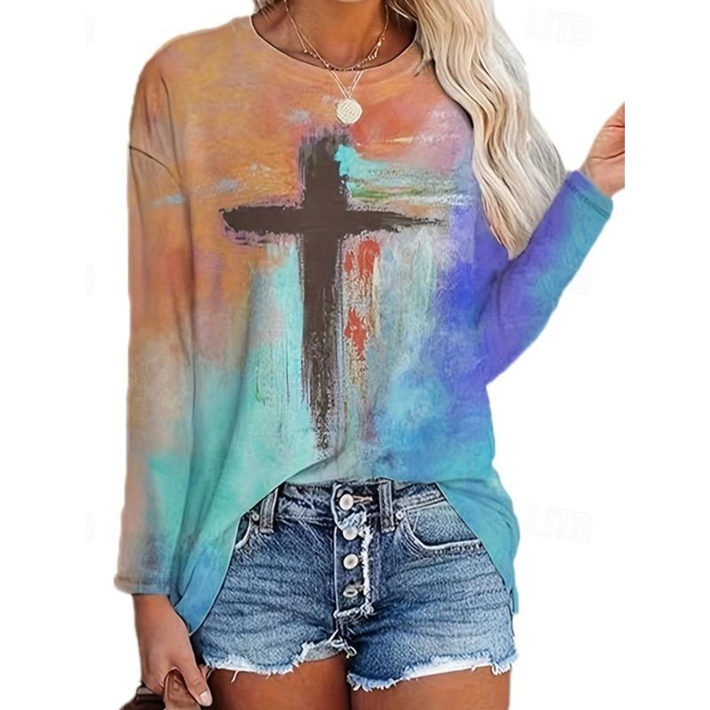 Fashion Women's T shirt 3D Print Faith Cross Graphic Casual Tee Holiday Fashion Long Sleeve T-shirt O-Neck Sweatshirt Pullover