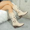 Fashion Women's Fashionable Breathable Hollow Embroidered Vintage Western Boots Chunky Heels Knee High Cowboy Boots Woman Knight Booties