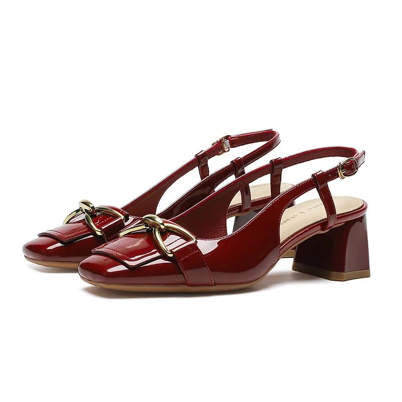Móda 2025 Léto Dámské Vysoké Podpatky Módní Lakovaná Kůže Čtvercová Špička Střední Podpatek Sandály pro Ženy Kovová Spona Dekorace Slingback Lodičky