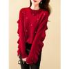 Heavy Industry Bead Crew Neck Knitted Sweater Women's Wear Autumn and Winter Fashion Splicing Fungus Edge Loose Long Sleeve Sweater