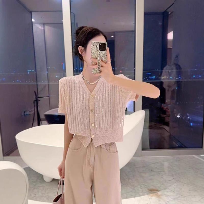 Short-sleeved sequined knitted cardigan spring and summer new design thin sweater jacket women
