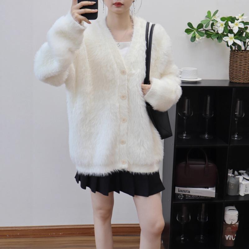 V-neck imitation mink velvet knitted cardigan autumn and winter new loose and gentle wind soft waxy sweater jacket women