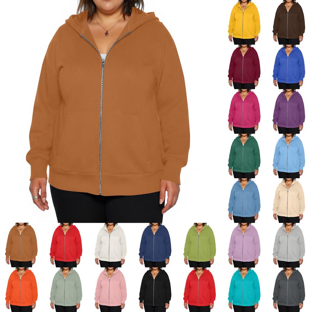 Dámská módní ležérní plus size bunda s dlouhým rukávem na zip jednobarevná s kapucí
