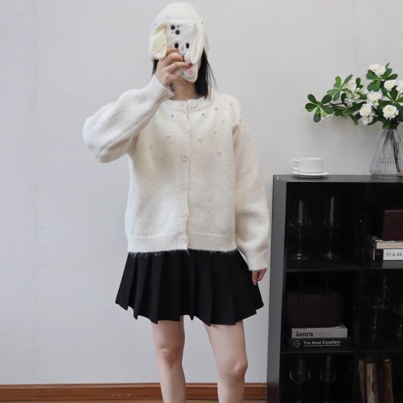 Heavy Industry Bead Design Sense Hat Knitted Cardigan Autumn and Winter New Gentle Wind Loose Sweater Jacket Women