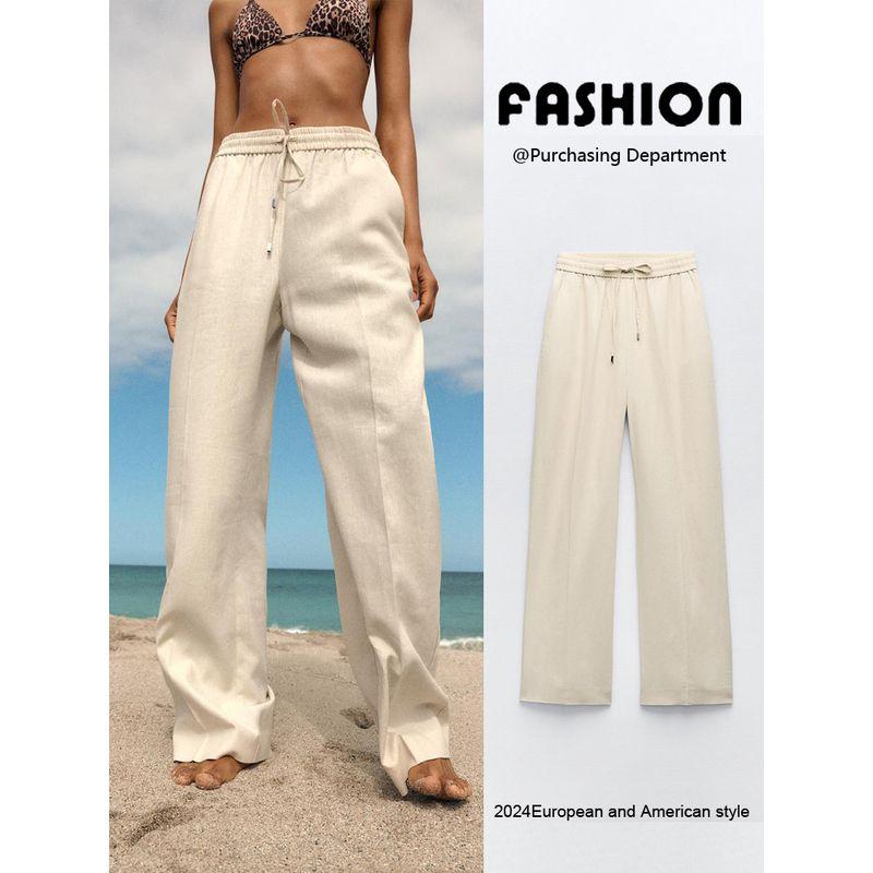 Za2024 Summer New Product Women's Clothes Drawstring Elastic Waist Linen Wide Leg Casual Straight Pants 9929040 401