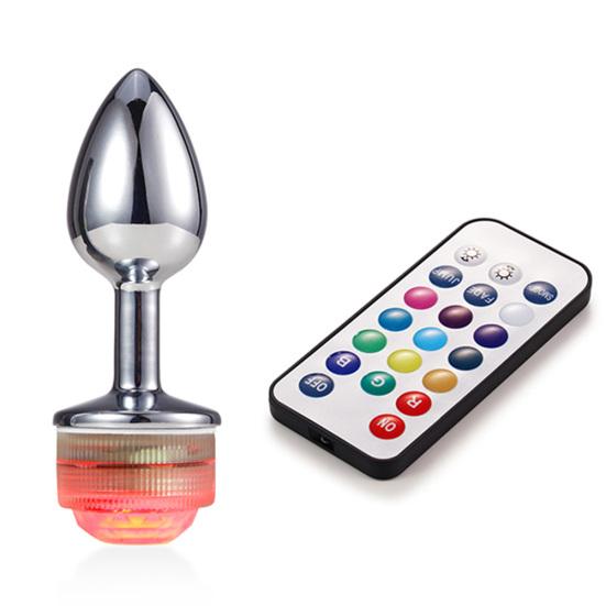 Sexuální hračka s kovovým análním dilatátorem s korálkem na dálkové ovládání měnící barvu LED světla