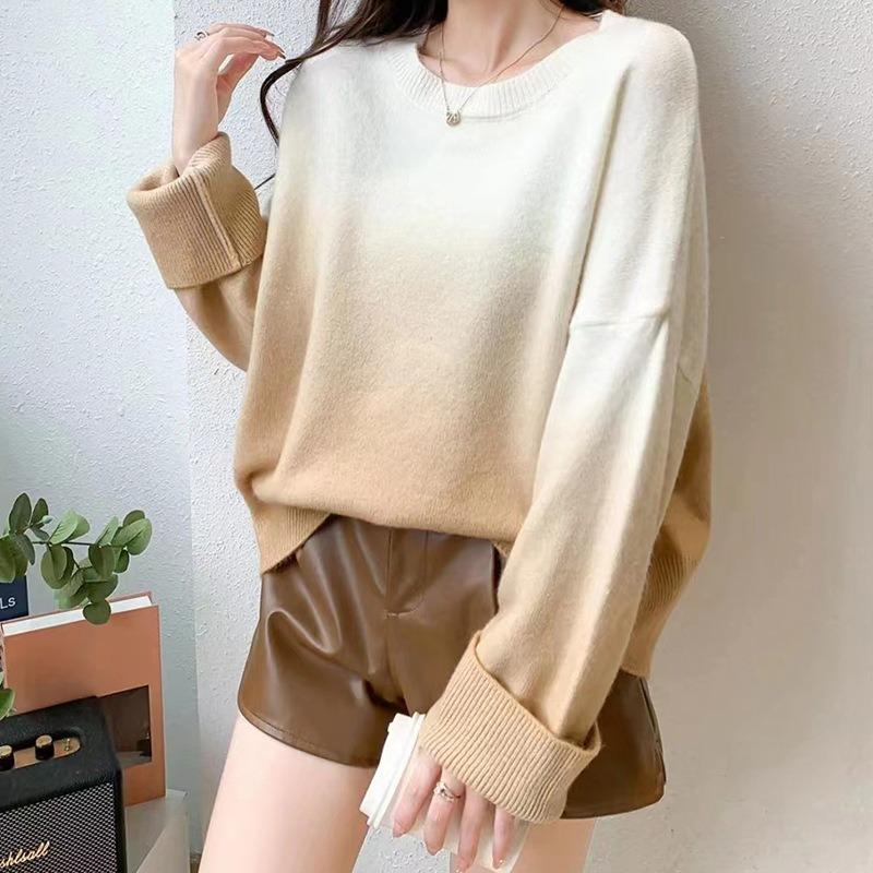 Trendy new rainbow color hanging dye gradual change color matching loose round neck soft waxy pullover knitted sweater women