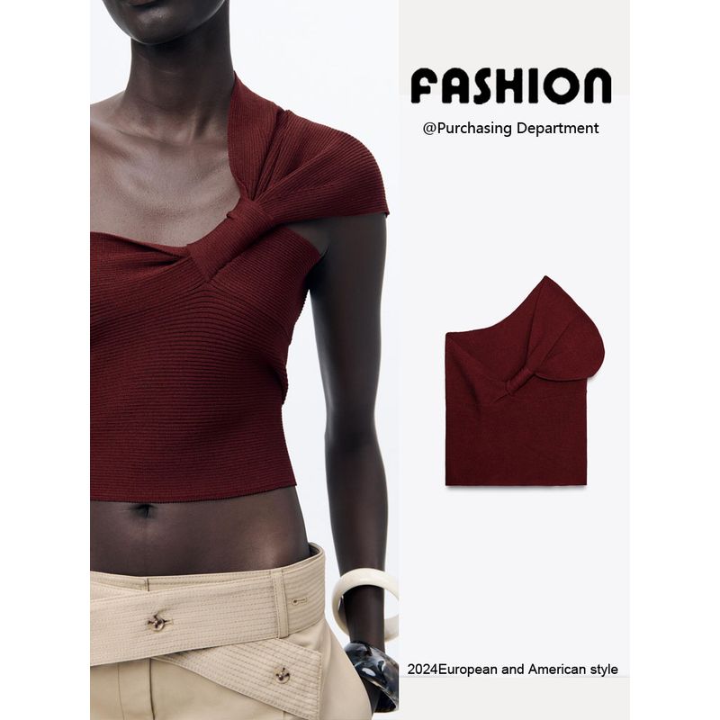Za2025 Spring New Women's Clothing Elastic Slim Fit Slimming Asymmetric Shoulder Strap Knitting Rib Tops 9598100