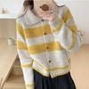 Vintage contrasting color striped polo neck sweater cardigan women's early spring new loose plush long-sleeved jacket