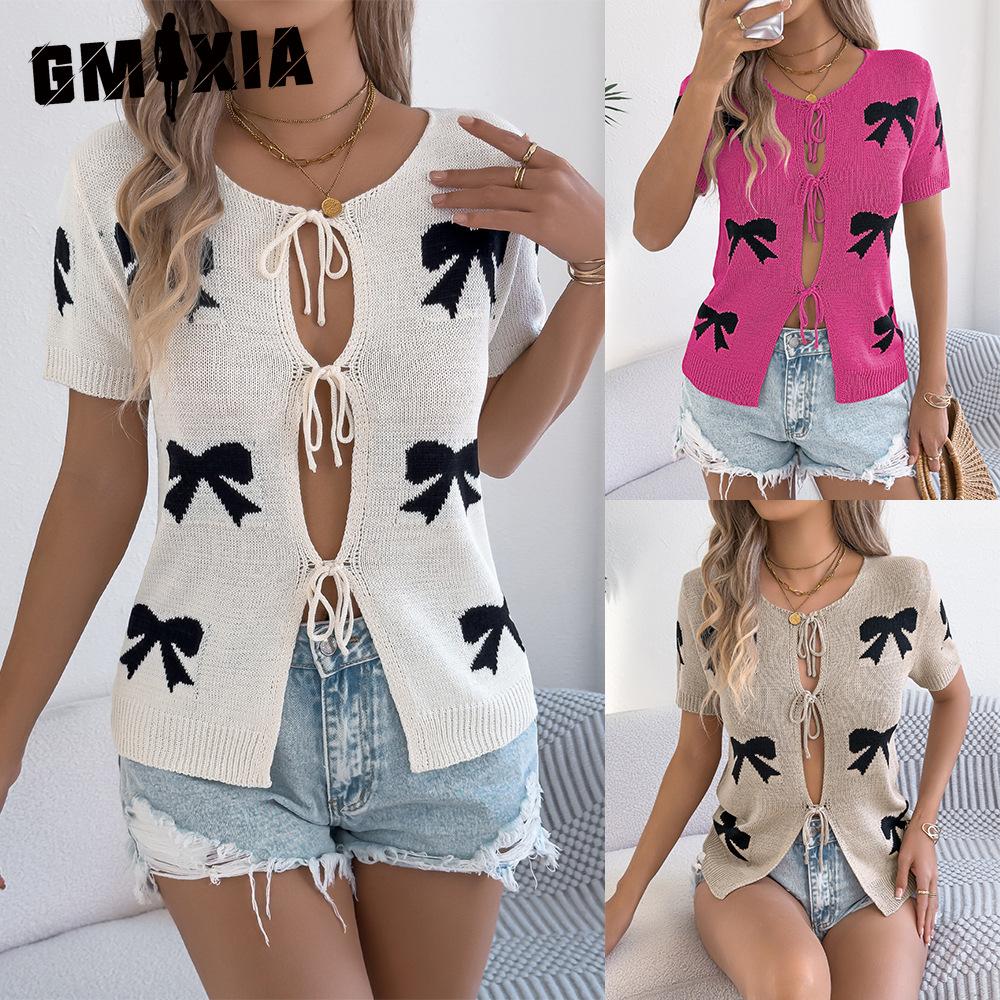 GMXIA Spring Summer Casual and Sexy Color-blocking Bow Tie Knit Sweater Vacation Cardigan Women's Wear