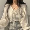 Women's Spring-summer Knitted Cardigan Thin Sunscreen Lace-up Knitted Tops Women's Korean Style Short Coat with Lantern Sleeves