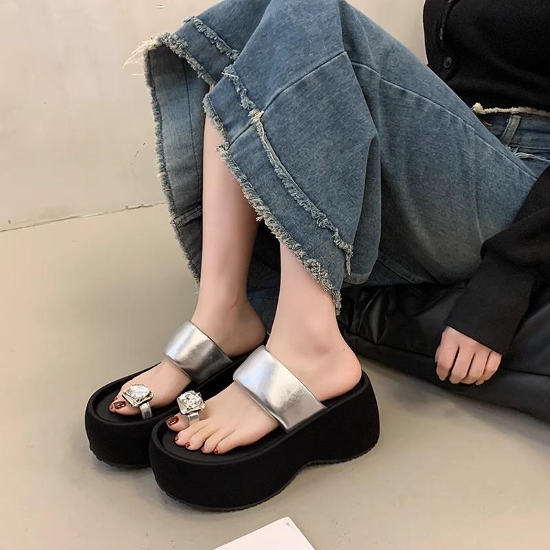 Niche design sense toe sandals women's summer new rhinestone thick bottom one word sandals outside slippers