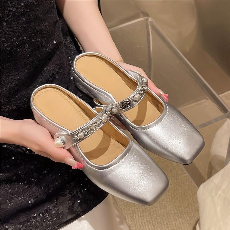 Fashion Inside Heightened Wrapped Head Semi-drag Fashion Square-toe Shallow-mouth Metal Buckle One-band Soft-sole Non-slip Flat Shoes