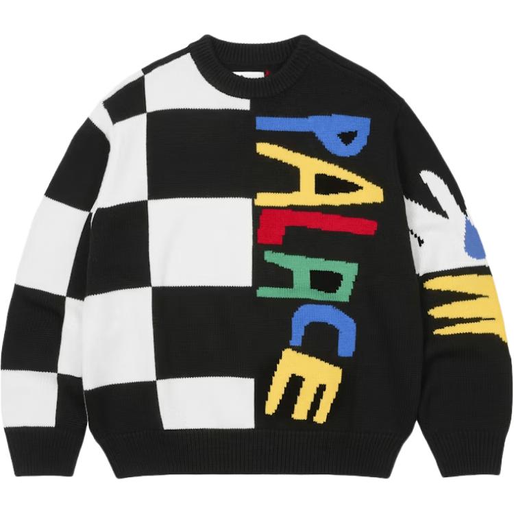 Palace X Jcc+ Collaboration Ss25 Drop8 Black And White Plaid Letter Pattern Printed Ribbed Edge Knit Crewneck Loose Sweater Unisex sweater P28JCCKW001