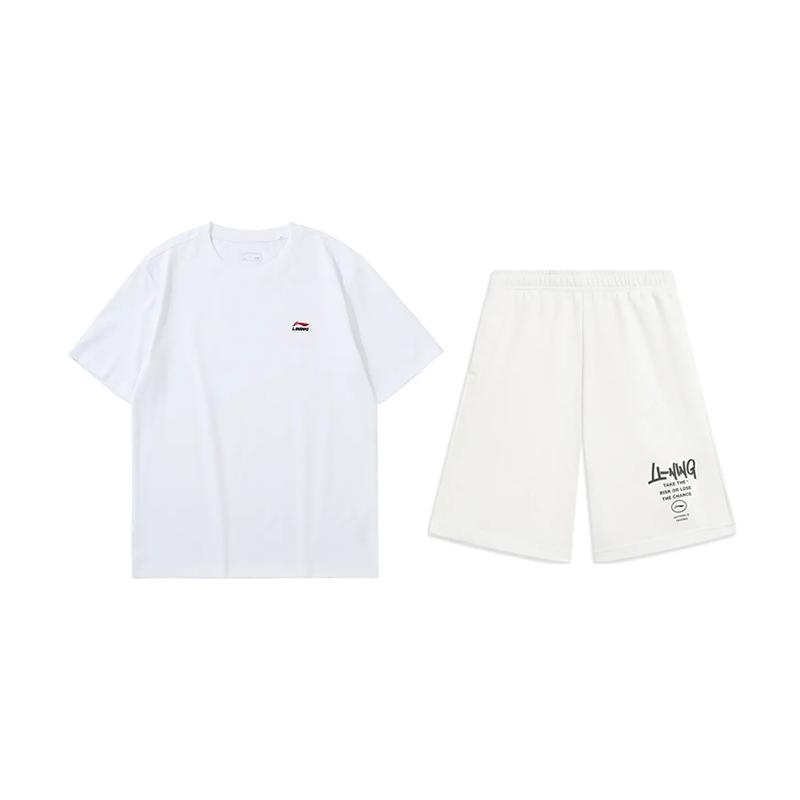 Li Ning Logo Fashion Simple Comfortable Breathable Round Neck Pullover Short Sleeve T-Shirt Casual Sports Set Unisex Tops White AHSU801-1+AKST593-7