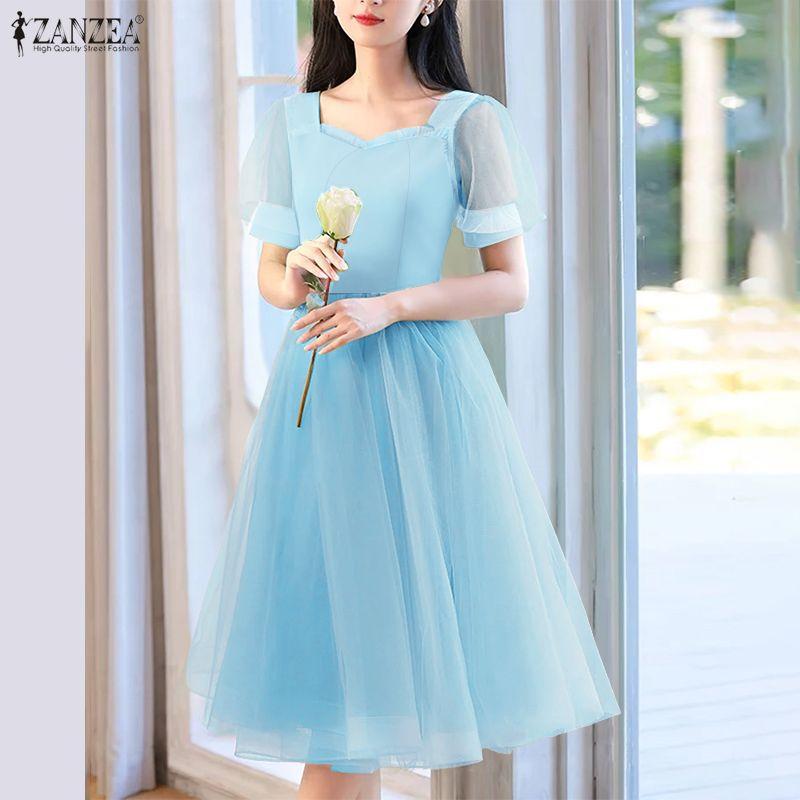ZANZEA Womens Summer Casual Mesh Splice Short Sleeve Elegant Dress