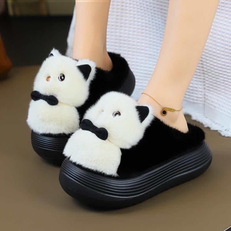 Fashion New cartoon panda fluffy slippers women's 5 cm platform mules clog shoes home slipper woman animal furry slides warm flip flops