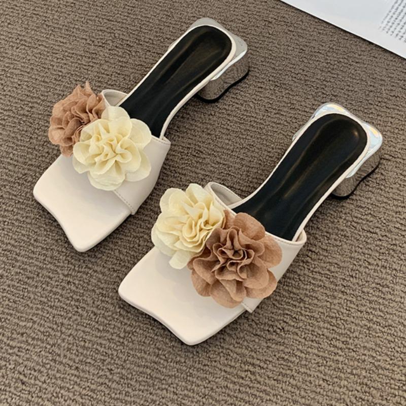 Fashion Women's Mid-heel Sandals Summer New Square Head Open Toe Flower Soft Sole Anti-slip Wear-resistant Square Slippers