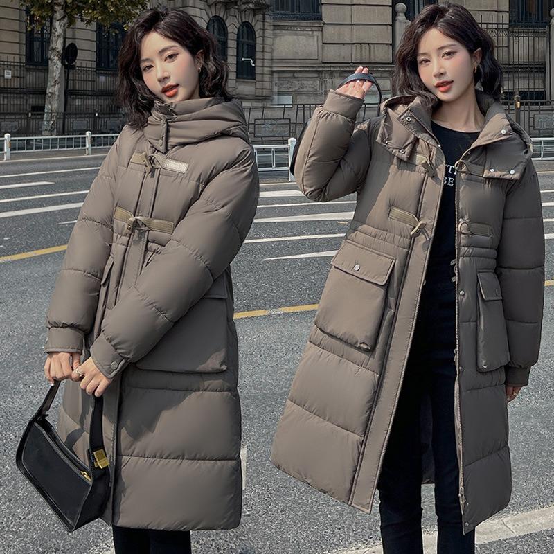 Large size hooded waist cotton-padded clothes for women's medium and long slim-fit warm down cotton clothes horn buckle jacket