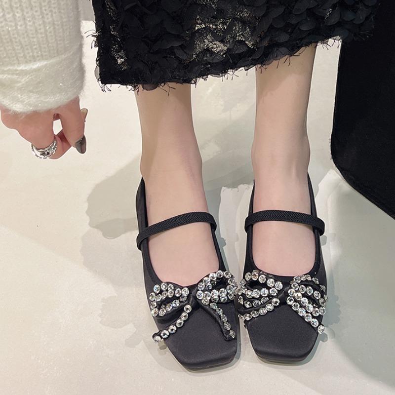Fashion Light Flat Shoes Spring New Style Square Head Shallow Mouth Satin Diamond Butterfly Knot Set Foot Soft Sole Single Shoes